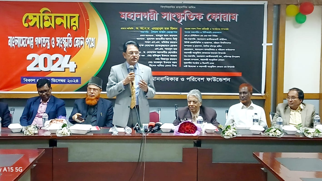মহান বিজয় দিবসের ৫৪ বছর উপলক্ষে মহানগরী কালচারাল ফোরামের উদ্যোগে জাতীয় প্রেস ক্লাবে বুধবার (৪ ডিসেম্বর) 'নাগরিকের ভাবনা : বাংলাদেশের গণতন্ত্র ও সংস্কৃতি কোন পথে' শীর্ষক সেমিনার অনুষ্ঠিত হয়। সেমিনারে প্রধান অতিথি ছিলেন সাবেক শিক্ষা প্রতিমন্ত্রী ও সংগঠনের উপদেষ্টা ড. আ.ন.ম এহছানুল হক মিলন।